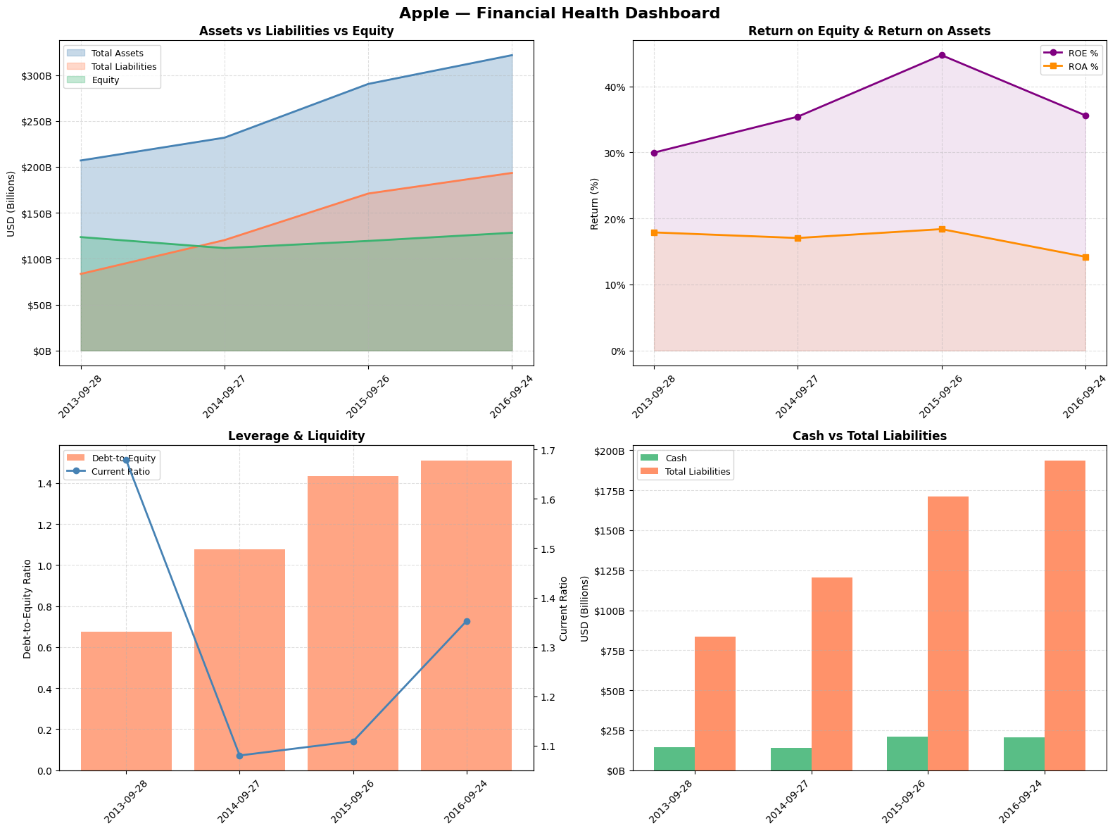 fig.suptitle(f'{company} - Financial Health Dashboard', fontsize=16, fontweight='bold')
