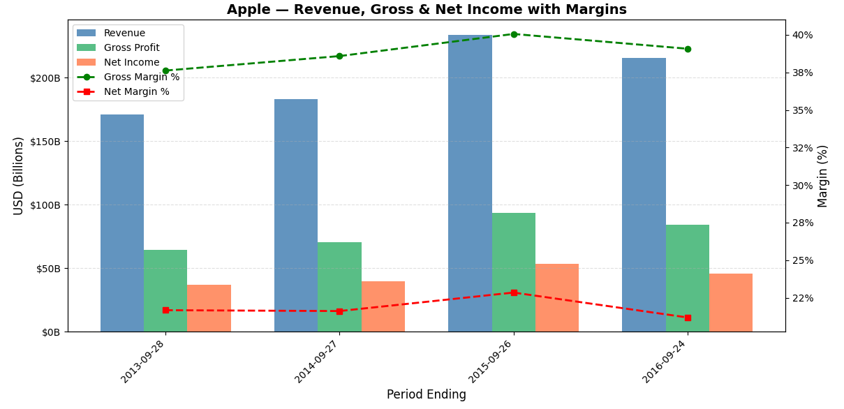 ax1.set_title(f'{company} — Revenue, Gross & Net Income with Margins', fontsize=14, fontweight='bold')