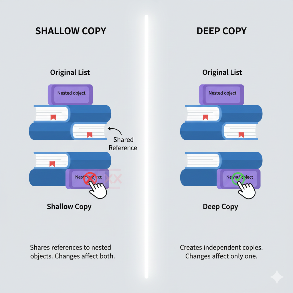 When working with Python collections (lists, dictionaries, sets, etc.), understanding how copying works is crucial for avoiding bugs. Python has two types of copying: shallow copy and deep copy. This tutorial will explain the difference with detailed examples and practical use cases.